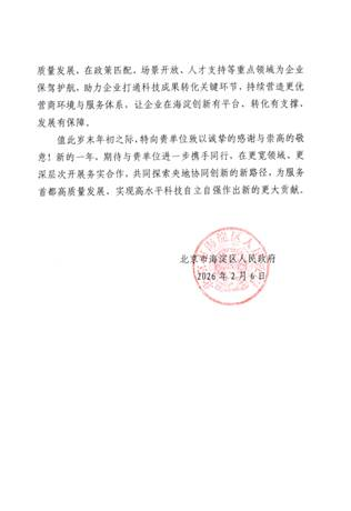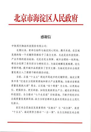 克日,,,现代Z6尊龙凯时公司收到来自北京市海淀区人民政府的谢谢信,,,信中对现代Z6尊龙凯时公司恒久以来在科技立异、工业升级、民生包管等诸多方面给予的鼎力大举支持体现衷心的谢谢。。。。